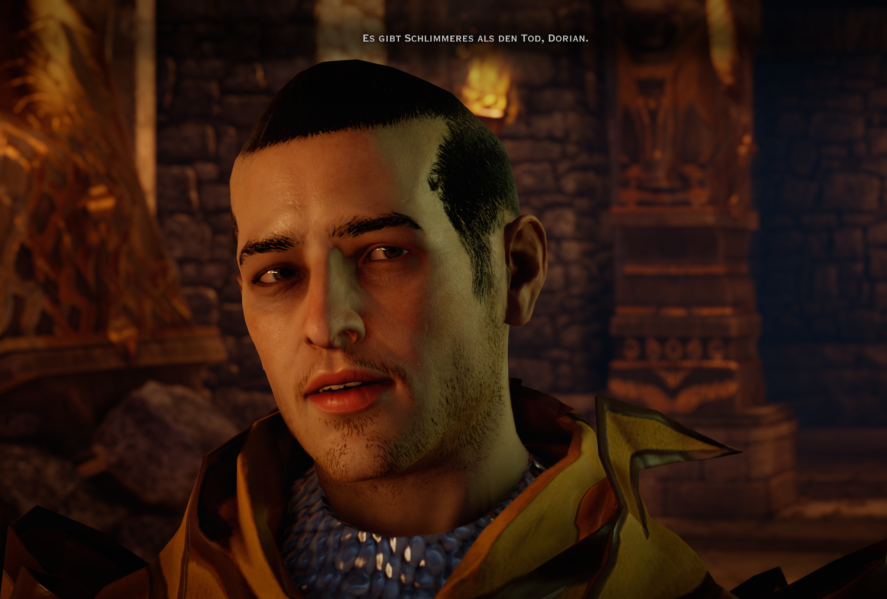 Anschließend stellt sich Euch der geheimnisvolle Magier vor, der eben an Eurer Seite gekämpft hat. Dorian Pavus, ehemaliger Schüler von Alexius und unfreiwilliger Mitwisser um Alexius' dunkles Geheimnis. Manövriert Euch munter durch die ersten Dialogoptionen, bis Ihr den Punkt erreicht, an dem er Euch von Alexius' Magie berichtet.