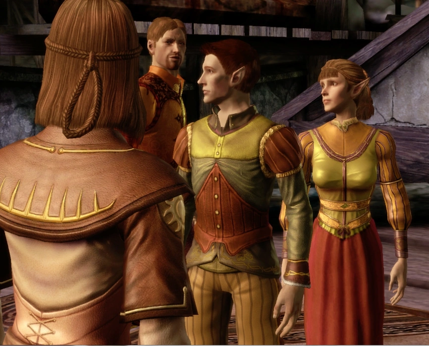 Nachdem dies geklärt ist, sucht und findet der angehende Wächter seinen Cousin Soris, der heute ebenfalls heiraten soll. Auf dem Weg zu Shianni trifft der Stadtelf Taeodor, der erzählt, dass seine Cousins die mysteriösen Dalish-Elfen suchen.