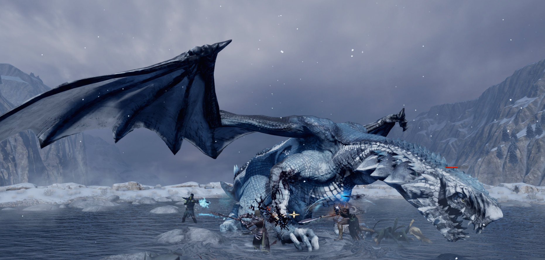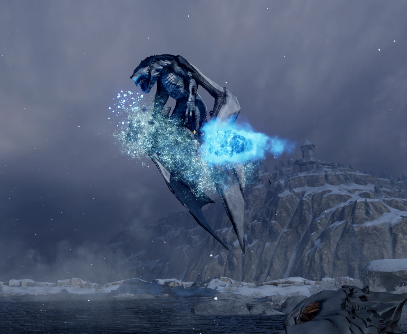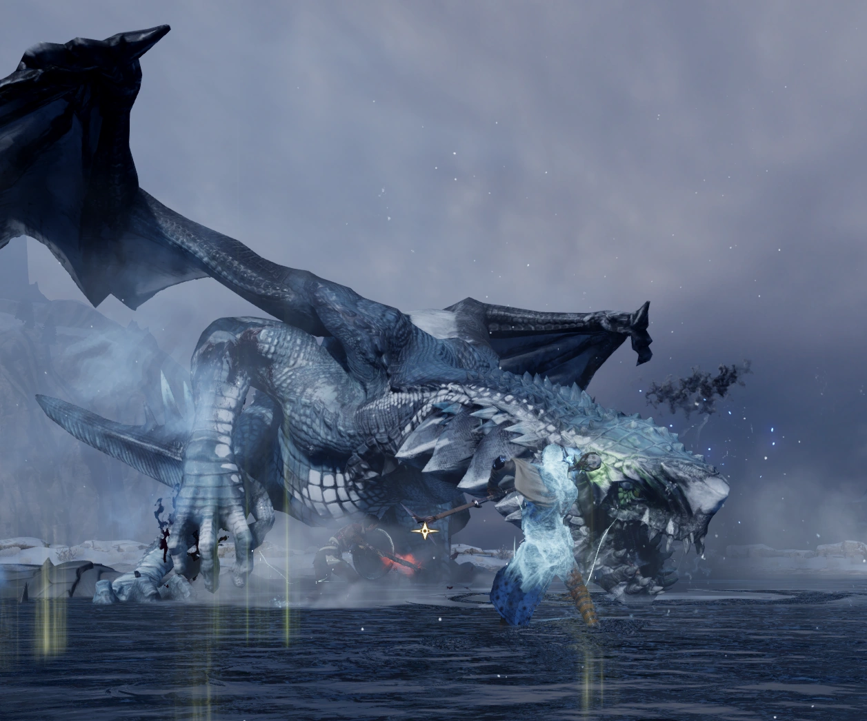 - Sobald sein Leben die 20-%-Marke unterschreitet, hebt der Hivernal noch einmal ab. Es gelten dieselben Regeln wie schon zuvor, allerdings nutzt er dieses Mal auch ausgiebig seinen Eisatem, während er über das Schlachtfeld hinwegfliegt.