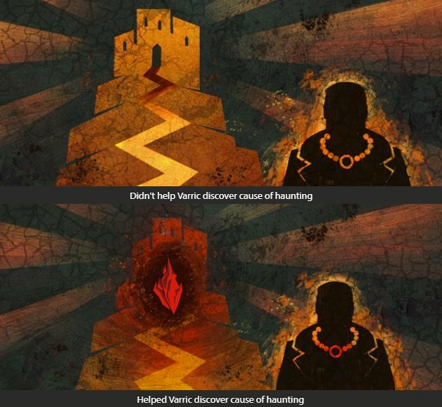 - Varric: Seine Reaktion auf Hawkes Ratschlag am Schluss des Quests hängt von ihrer Beziehung zueinander ab. Eine Freundschaft führt zu tieferer Freundschaft und umgekehrt.