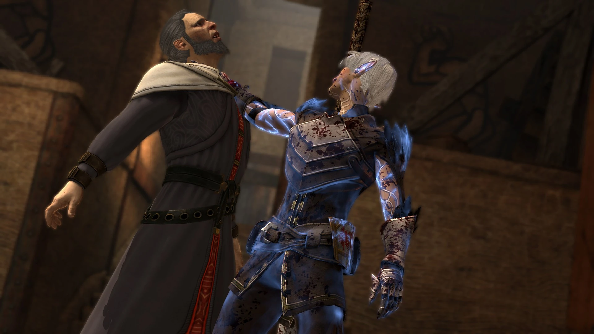 If you did not let Danarius take Fenris then you'll be attacked by several waves of enemies. First, two small waves of slavers, weak to fire. Next, a wave of shades and a rage demon, then a wave of corpses, spawning all over the tavern, so use electricity and cold. After that, another wave of shades and then another wave of corpses. Unlike previous bar brawls in the Hanged Man, Isabela and Varric are not present to join this fight as invincible allies, but the fight can still be won as long as Fenris is put to do what he does best; clearing out Critter ranks by the score. Sataareth and Voracity will be very useful here, as well as Bloom and The Celebrant if you've managed to obtain them, but switch them out for the element that best suits the current wave. Bring Anders for the rage demon if you don't have Bloom. Danarius is a Boss-ranked Slaver Mage, so use unleash fire on him to deal the most damage while avoiding cold. He becomes targetable at the first wave of corpses, and the battle ends as soon as he falls, regardless of how many shades and corpses are left. Players seeking a quick end to the fight may want to charge him to force him to teleport to the entrance, then use the upper hallway of the Hanged Man as a choke point.