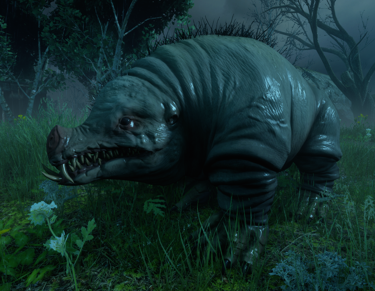 As we entered the caves, the cold and brackish water dripping incessantly, we came upon a hulking beast whose great flapping paws slapped the stone. In countenance it was broad, its flaps of hide hanging loose across its bristled back. D'Archambon drove it away, laughing at its clumsiness, heedless of the declinate fangs protruding at unknowable angles from its distended maw. He said the beast, or "bogfisher" as the locals called it, was a failing vestige in the land of men, fit to be tamed or slain.