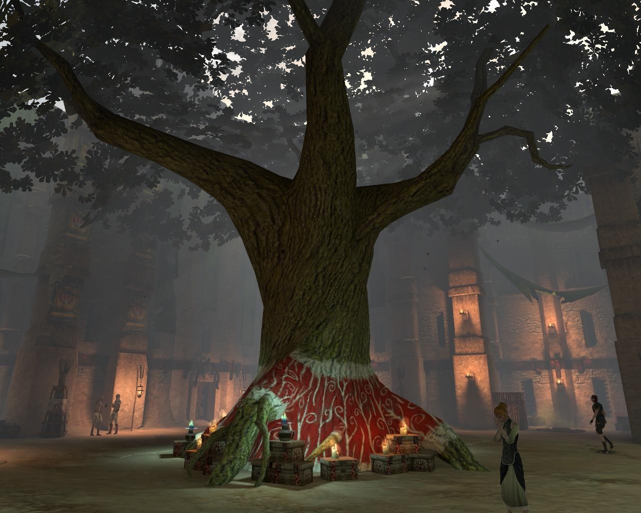 This huge tree, often brightly adorned and lovingly tended by the community against the poverty and slums, serves as a symbol of Arlathan―the first elven homeland―with its roots deep and branches reaching for the sky. In Denerim the vhenadahl is arguably the tallest and most vibrant tree in the entire city, and in Val Royeaux, for example, the elves leave offerings of brightly-colored cloth or ribbons at the foot of their tree, while the elves of Kirkwall paint theirs in bold designs.[2] Some alienages, however, have cut their vhenadahl down out of necessity for firewood in a brutal winter, or have simply forgotten its meaning.[3][1] Sometimes the tree may also be cut down and destroyed against the elves' wishes, as punishment by local rulers.[4]