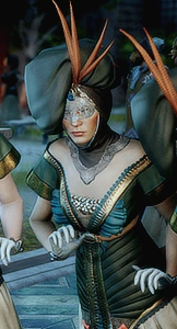 Lady Fleur and her fellow handmaidens act as the public face of Empress Celene. They wear the mask of House Valmont, which identifies them as such. Incidentally, Lady Couteau notes that the masks are extremely fashionable.
