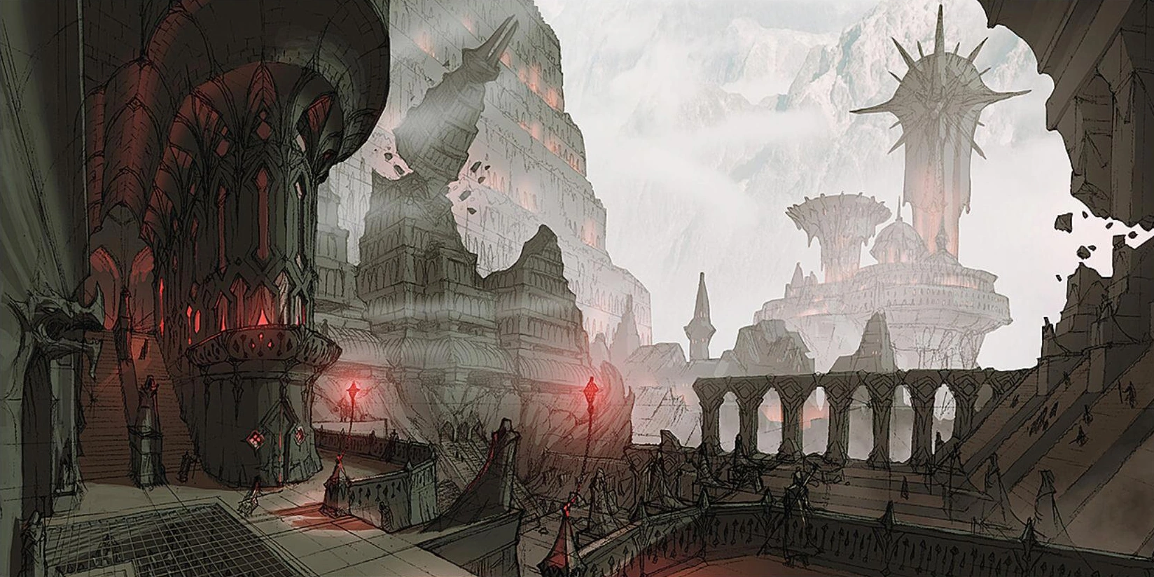 Once the center of the world, vestiges of Minrathous' power and artistry can still be seen, yet are marred by the wear of time.[9] Buildings that would otherwise collapse are kept upright by powerful magic[10] and general wear and grime permeate the poorer quarters of the city. The high towers of the mage elite rise above the small homes of peasants and slaves, literally elevating the upper echelons of society away from the worst of the poverty. The disparity between social classes has been exacerbated in the Dragon Age, as the outskirts of the city fill with refugees fleeing from the Imperium's never-ending war against the Qunari.[9]